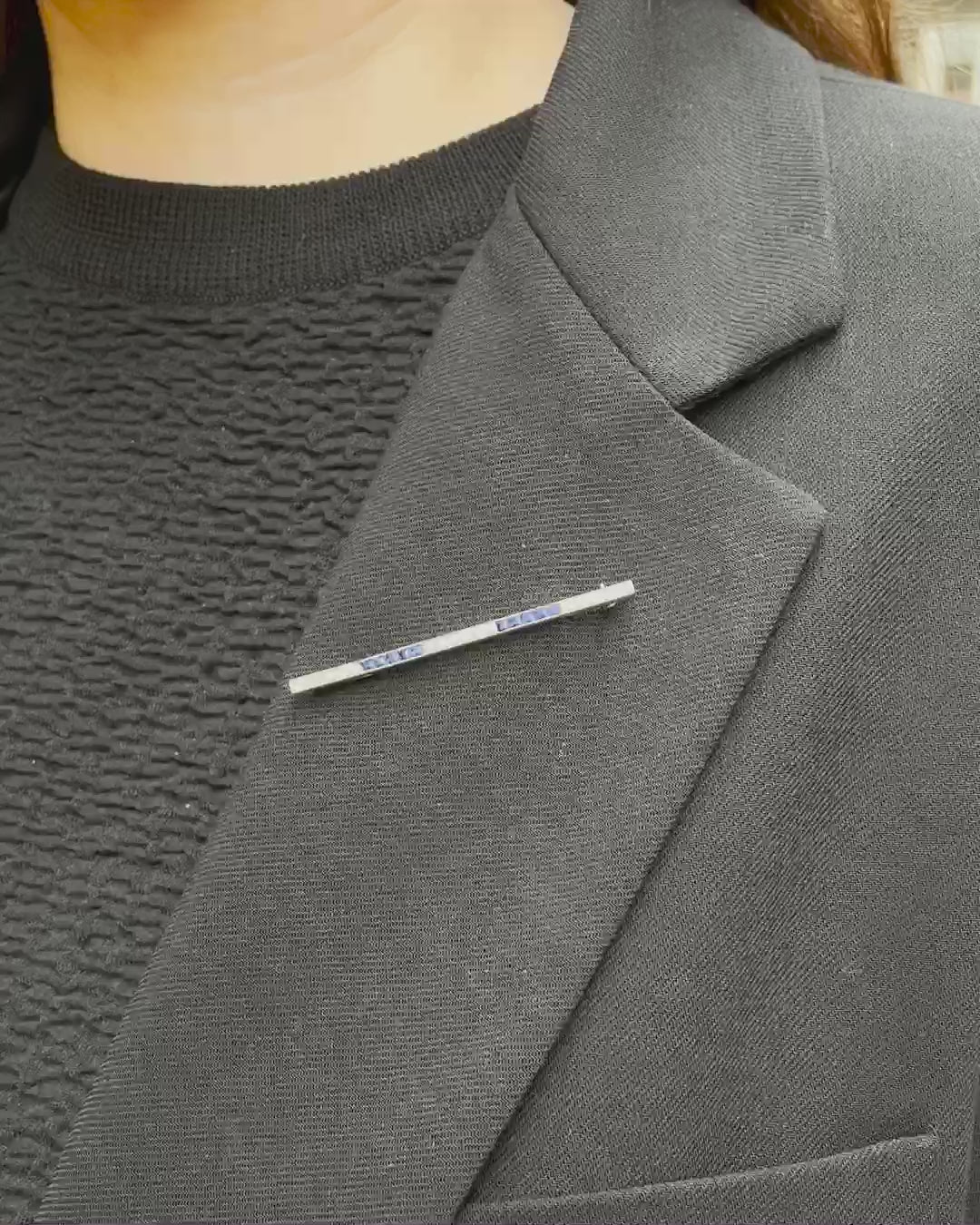 Platinum barrette brooch composed of a geometric pattern formed by an alternation of six 8x8 cut diamonds (for a total weight of 0.5 carat) and 5 calibrated square sapphires (for a total weight of 0.3 carat) , the edges of the barrette are decorated with a delicate floral decoration. Probably French work early 20th century
