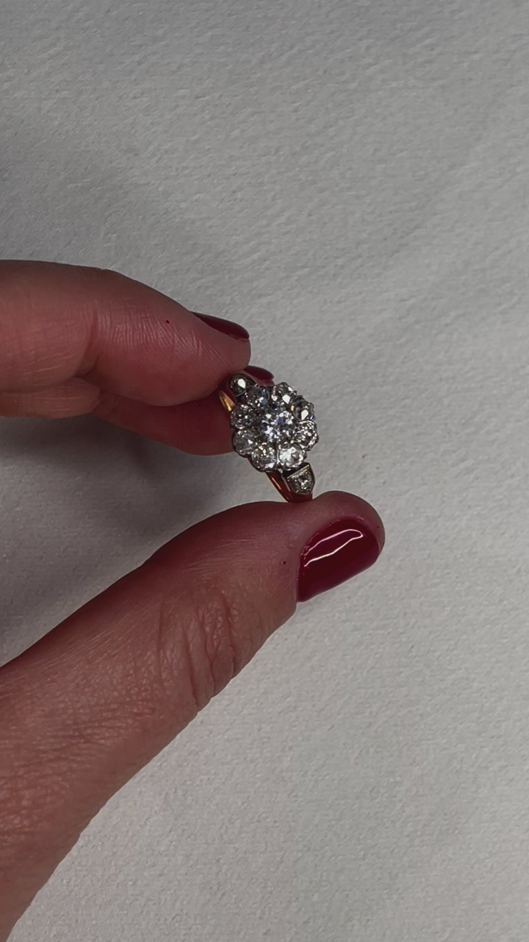 Bague marguerite en or 18k (750°/°°) et en platine sertie en son centre d'un diamant taille ancienne Old Mine Cut de belle qualité pesant environ 0,4 ct dans un entourage de diamants taillés pareillement et pesant chacun 0,12 ct pour 1 ct au total. Travail français des années 1880.
