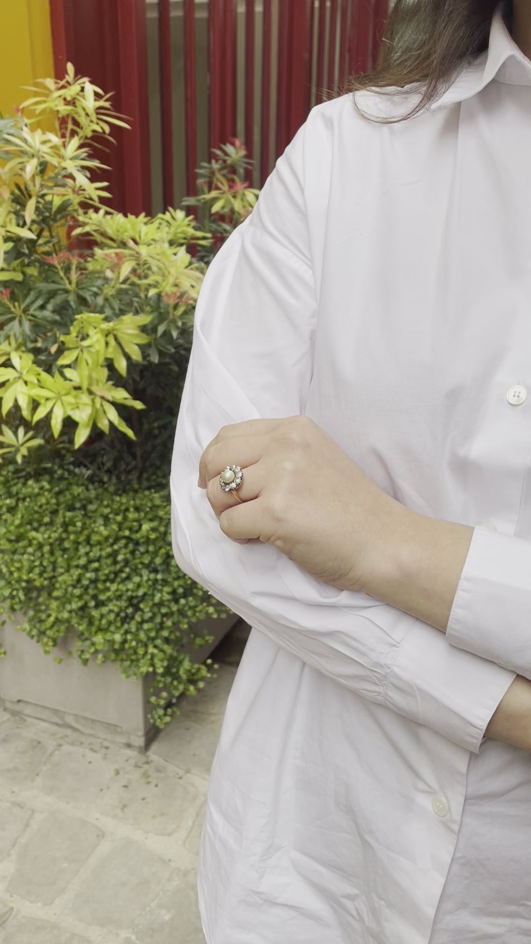Bague en or 18k (750°/°°) et argent sertie en son centre d’une perle fine de couleur créme très légèrement baroque de diamètre 7,7 mm belle qualité (reflets irisés verts et roses) dans un entourage de dix diamants Old mine Cut de qualité pour un poids total d’environ 1,2 ct de qualité estimée HI VS à S1 (quelques ébréchures marquées). Travail étranger datant du XIXème.