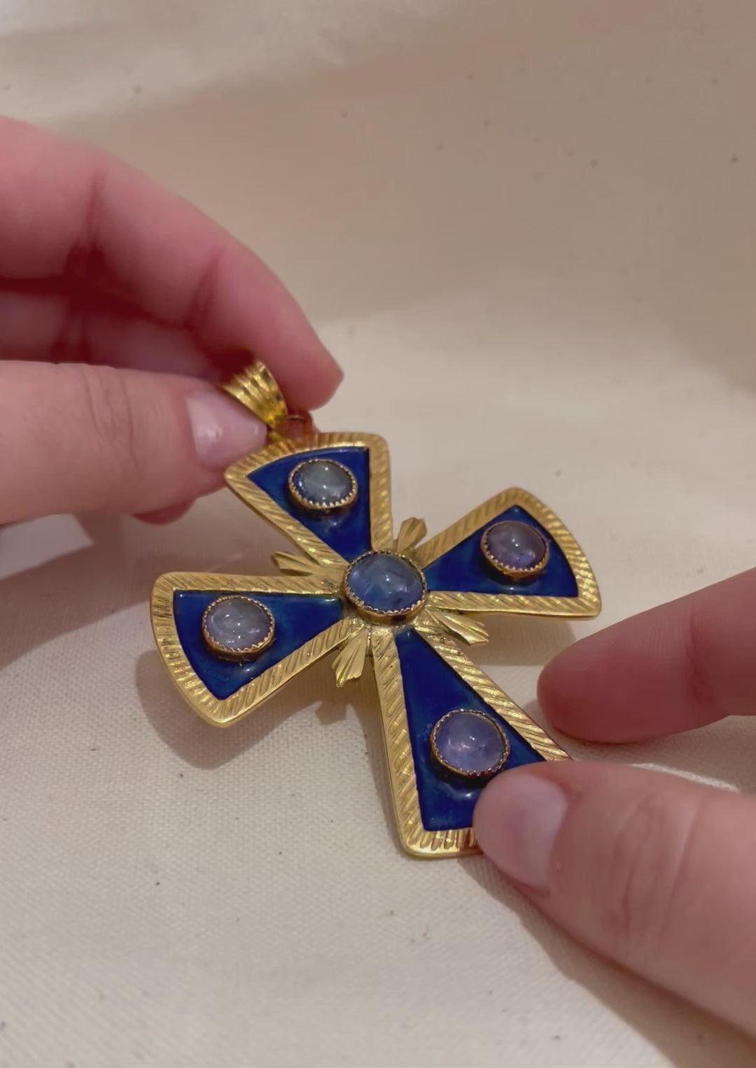 Pendentif croix pectorale or jaune émail cabochons de saphirs